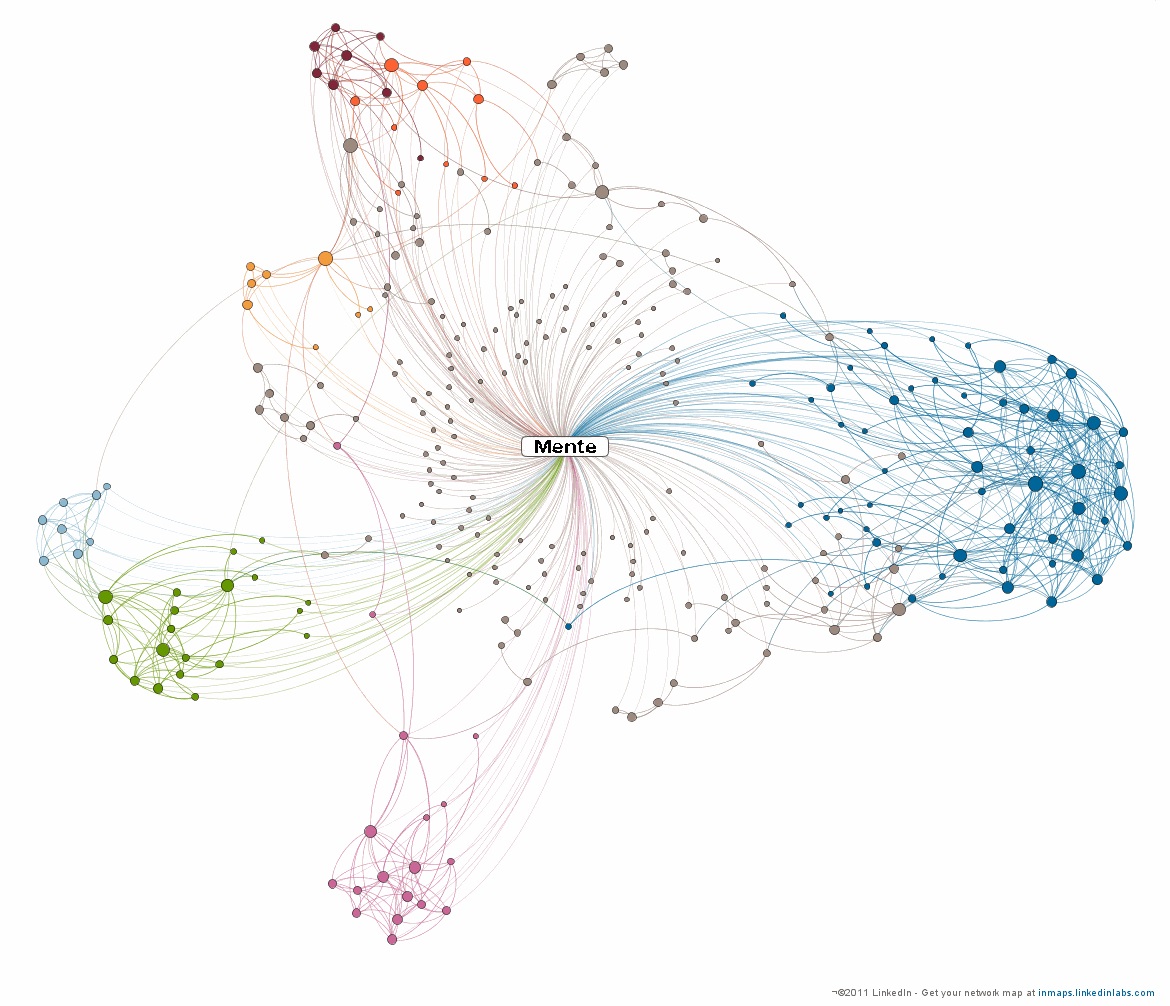 2) Aprende por ligações de assuntos, não por memorização de factos. Ou seja, relaciona os tópicos novos, com coisas que já saibas. É importante ver o conhecimento como uma espécie de árvore. Deves perceber o tronco e os ramos antes das folhas, senão não têm nada a que se agarrar. Aqui está um exemplo de um artigo que faz precisamente isso e que usa o estilo Feynmaniano de explicar as coisas por termos simples. Outra maneira de ver isto é como na imagem em baixo. Cada ponto representa um conceito/ideia. Quanto maior um ponto, maior o número de ligações que tem com outros pontos, ou maior seu impacto em ti. Exemplos de pontos desses são conceitos gerais e/ou com carga emocional: amor e liberdade(ambos), nomes dos familiares (emocional), ser vivo (conceito geral). Os agrupamentos representam assuntos do mesmo tema. O processo ideal de aprendizagem é o de aprender por relações (um bom exemplo de relações são analogias). O cérebro efetivamente cria ligações físicas muito semelhantes às que estão representadas na imagem (c.f. Brain Rules do John Medina). Ao memorizares factos estás simplesmente a criar pontos desligados de tudo o resto, o que torna o trabalho de aprender bastante mais difícil e ao mesmo tempo mais fácil de esquecer. Várias técnicas de memorização utilizadas por desportistas de memória assentam precisamente no facto de não só interligarem aqilo que querem memorizar, mas com o cuidado de ser com pontos grandes, daí o facto de preferirem imagems o mais ridículas e pessoais possíveis.
